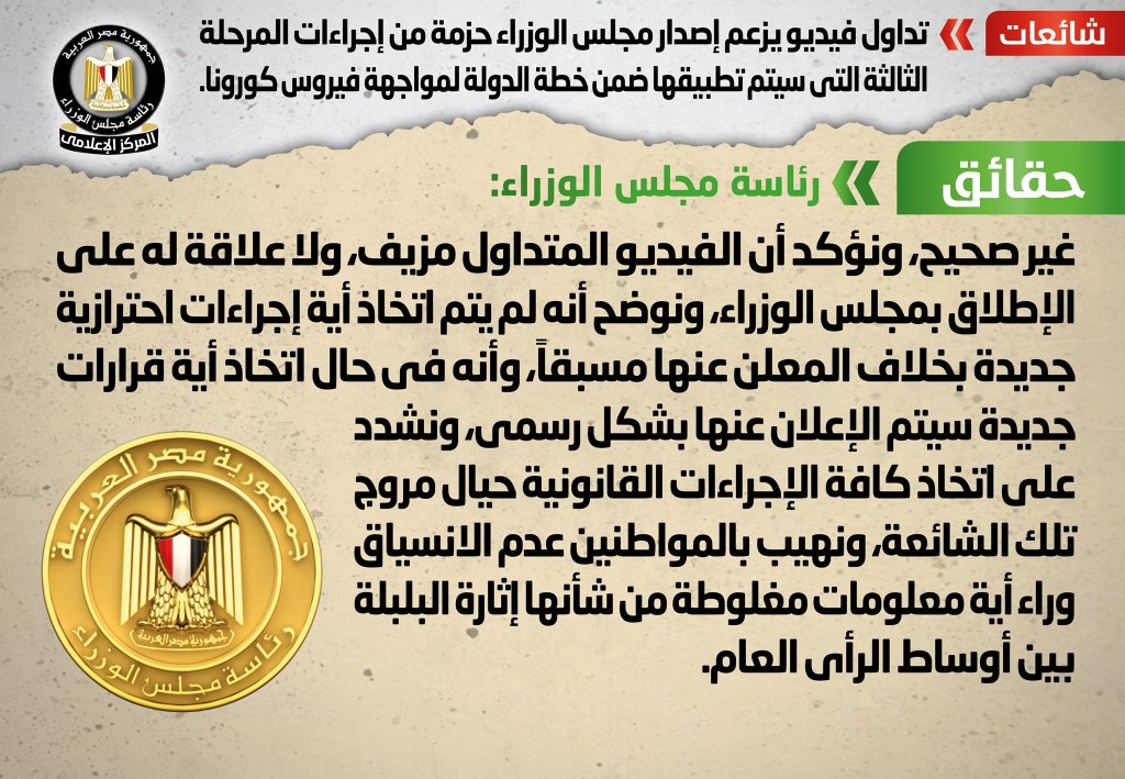 علق مجلس الوزراء، على حقيقة ما نشر عبر مواقع التواصل الاجتماعي، وبعض المواقع الإخبارية، عن بدء الحكومة المصرية المضي في تطبيق المرحلة الثالثة من مواجهة انتشار فيروس كورونا.