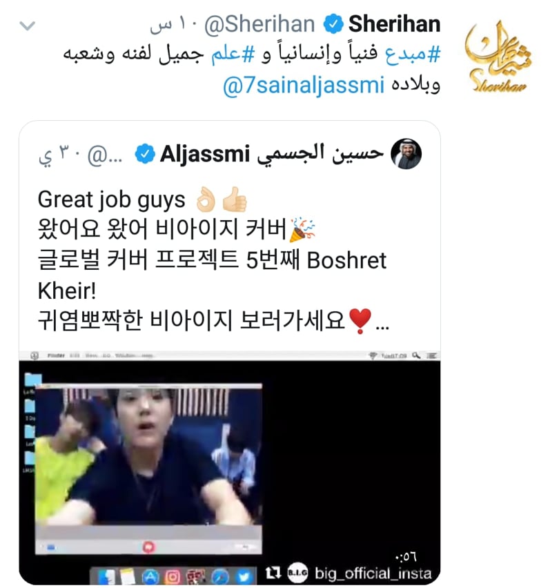 وشاركت "شريهان" جمهورها عبر موقع التغريدات "تويتر"، مقطع فيديو لمجموعة شباب صينين، وهم ينشدون أغنية "بشرة خير" والتي غناها "الجسمي"، مُعلقة عليه: "مبدع فنيًا وإنسانيًا وعلم جميل لفنه وشعبه وبلاده".