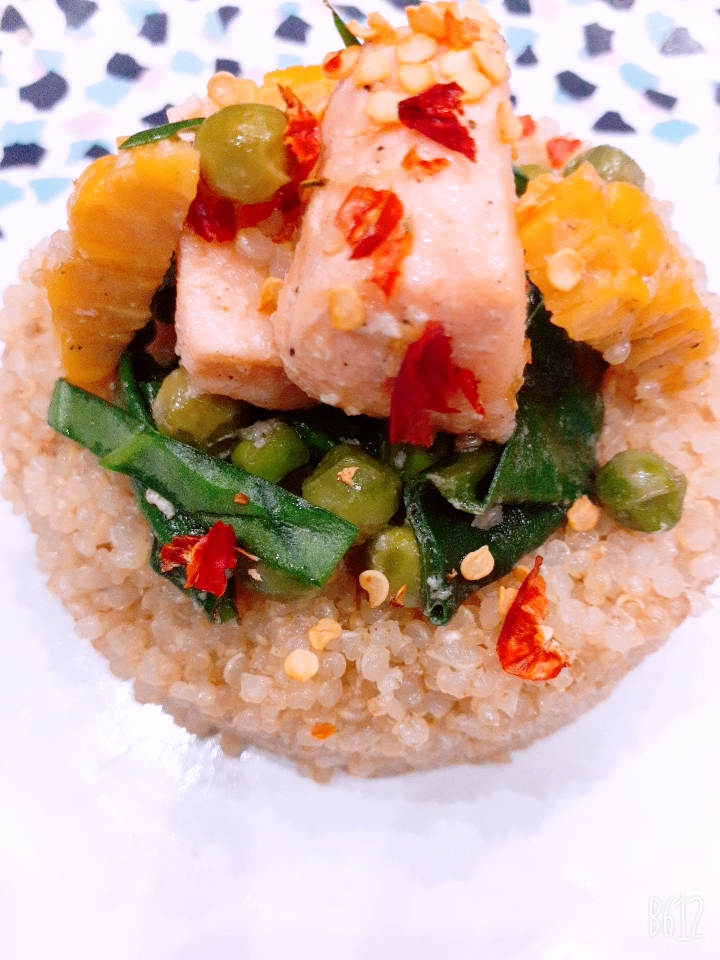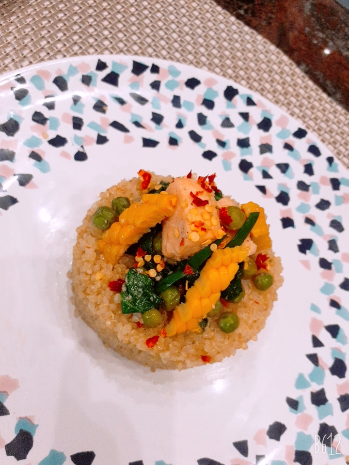ضع اناء آخر علي النار ويتم خلط السبانخ بالبسلة المسلوقة بزيت زيتون وثوم مفروم مع الذرة الصفراء وفلفل حار لمن يحب .