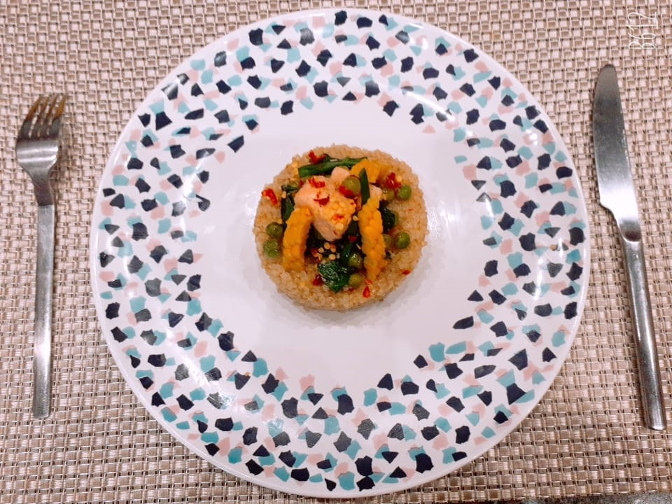 نضع اناء علي النار ويضاف اليه زيت الزيتون بالثوم المفروم علي النار وتخلط بالكيري وقطع السالمون