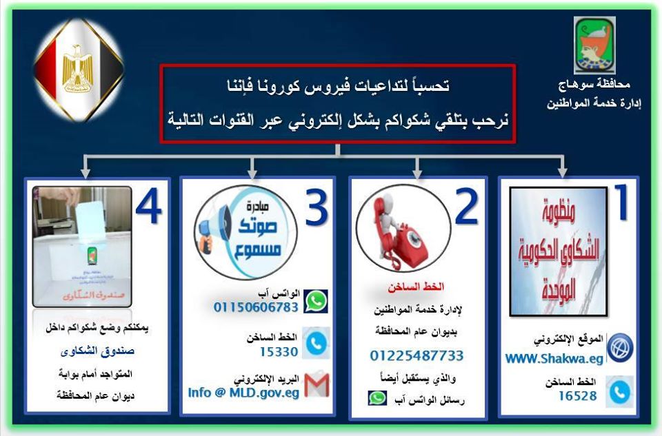 وجه اللواء طارق الفقي محافظ سوهاج، باتخاذ الإجراءات اللازمة للاستجابة لشكاوى المواطنين وبحث آليات استقبال شكاوى المواطنين والرد عليها تحسبا لتداعيات فيروس كورونا، من خلال الرد على موقع التواصل الاجتماعي "واتس آب" الخاص بإدارة خدمة المواطنين بديوان عام المحافظة وتفعيل الآليات الآخرى ضمن منظومة الشكاوى الحكومية الموحدة.