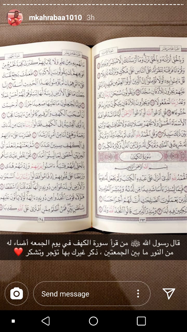 نشر محمود عبد المنعم كهربا، صانع ألعاب النادى الأهلي، سورة الكهف عبر حسابه الشخصى على موقع انستجرام، لإحياء سنن يوم الجمعة فى شهر رمضان المبارك، وعلق كهربا على الصورة قائلاً: قال رسول الله صلى الله عليه وسلم" من قرأ سورة الكهف فى يوم الجمعة أضاء له من النور ما بين الجمعتين، ذكر بها غيرك تؤجر وتشكر.