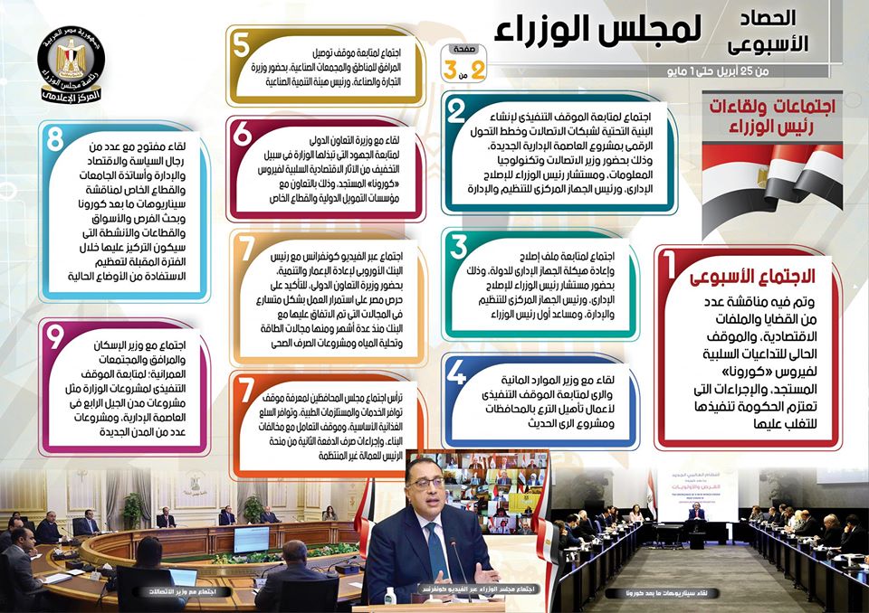بالإنفو جراف... الحصاد الأسبوعي لمجلس الوزراء خلال الفترة من 25 أبريل حتى 1 مايو 2020