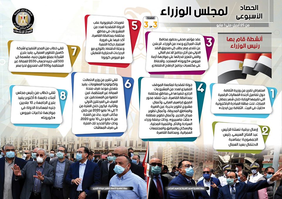 وبشأن الأنشطة التي قام بها السيد رئيس مجلس الوزراء، فبحسب الإنفوجراف، شملت استعراض تقرير من وزيرة الثقافة حول تفاصيل أجندة الفعاليات الرقمية التي تقيمها الوزارة خلال شهر رمضان المبارك، تحت مظلة المبادرة الإلكترونية "خليك في البيت.. الثقافة بين ايديك"، فضلاً عن عقد مؤتمر صحفي بحضور محافظ البنك المركزي وعدد من الوزراء، للإعلان عن تقدم مصر بطلب إلى صندوق النقد الدولي من أجل برنامج للدعم المالي والفني لتعزيز قدراتها على مواجهة أزمة فيروس "كورونا" المستجد، وللحفاظ على مكتسبات برنامج الإصلاح الاقتصادي، هذا بجانب قيام سيادته بجولة تفقدية لمتابعة الموقف التنفيذي لعدد من المشروعات الجاري تنفيذها في مناطق مختلفة بمحافظة القاهرة، حيث تفقد محور الفريق إبراهيم العرابي، وكذلك تفقد أعمال مشروع تطوير بحيـرة عين الصيرة والمناطق المحيطة، وأعمال تطوير ميدان التحرير، وأعمال تطوير منطقة "مثلث ماسبيرو"، وذلك برفقة وزراء السياحة والآثار، والتنمية المحلية، والإسكان والمرافق والمجتمعات العمرانية، ومحافظ القاهرة.