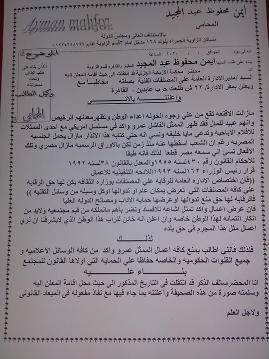 واختتم محفوظ انذاره بخطاب موصي به بعلم الوصول بالمطالبه بمنع كافه اعمال الممثل عمرو واكد من كافه الوسائل الاعلاميه و جميع القنوات الحكوميه والخاصه حفاظا علي حمايه الادب العامه ومصالح الدوله التي اولاها القانون للرقابه حمايه للمجتمع.