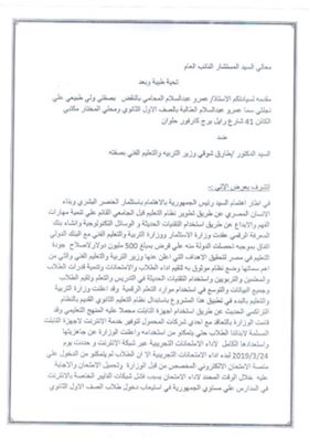 أمرالنائب العام بالتحقيق في البلاغ رقم 10135/2019 عرائض النائب العام المقدم ضد مسؤلي وزارة التربية والتعليم باتهامهم بإهدار المال العام في مشروع التابلت لتنفيذ المشروع دون وجود دراسات بحثية ودون وجود خطة حقيقية لاستخدام الأجهزة اللوحية، وثبوت فشل المشروع خاصة بعد صدور قرار وزير التربية والتعليم باستبدال الامتحانات الالكترونية بالامتحانات الورقية لعدد 10 آلاف طالب في امتحانات الدور الثاني.