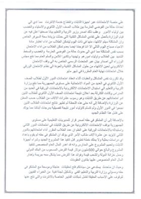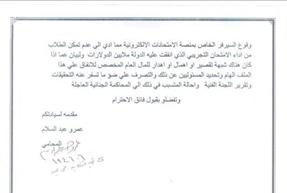 وقد طالب البلاغ بتشكيل لجنة فنية مستقلة من الخبراء الفنيين للوقوف علي الأسباب الحقيقة لفشل شبكات الفايبر الخاصة بالانترنت والتي نتج عنها وقوع السيرفر الخاص بمنصة الامتحانات الالكترونية، مما ادي الي عدم تمكن الطلاب من أداء الامتحانات ولبيان عما اذا كان هناك شبهة تقصير او إهمال او اهدار للمال العام المخصص للانفاق علي هذا المشروع وتحديد المسئوليين عن ذلك واحالة المتسبب في ذلك الي المحاكمة الجنائية العاجلة.