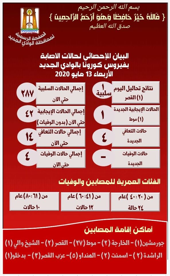 لبيان رقم (٢٠) للجنة متابعة أزمة فيروس كورونا المشكلة بقرار اللواء محمد الزملوط محافظ الوادى الجديد برئاسة نائب المحافظ :