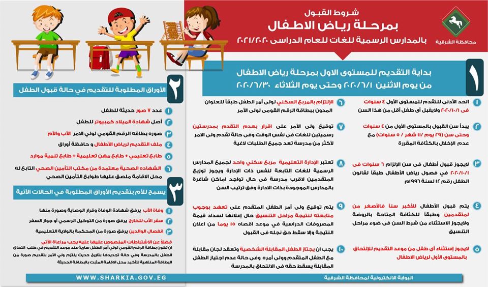 اعلن الدكتور ممدح غراب محافظ الشرقية شروط القبول بمرحلة رياض الأطفال بالمدارس الرسمية للغات للعام الدراسي ٢٠٢٠ /