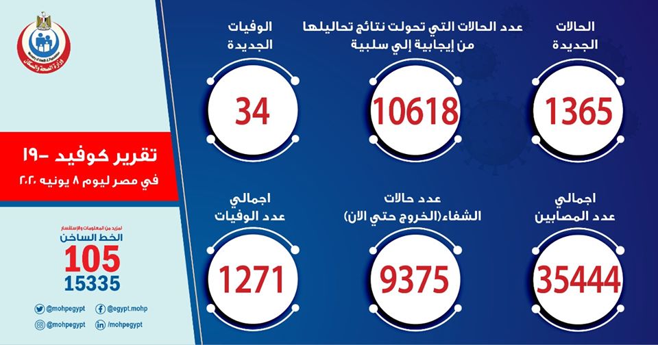 الصحة: تسجيل 1365 حالة إيجابية جديدة لفيروس كورونا.. و 34 حالة وفاة