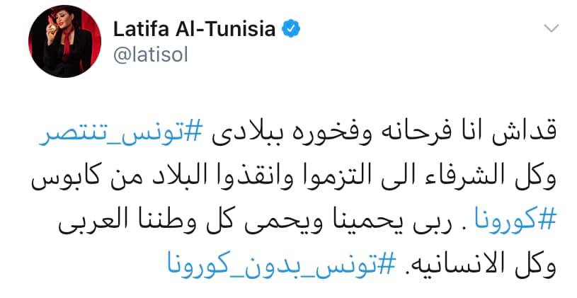 نشرت الفنانة لطيفة التونسية بوست علي صفحتها علي الفيسبوك قالت فيها انها فاخورة بشرفاء بلادي الذين النقدوها من فيرسو كورونا
