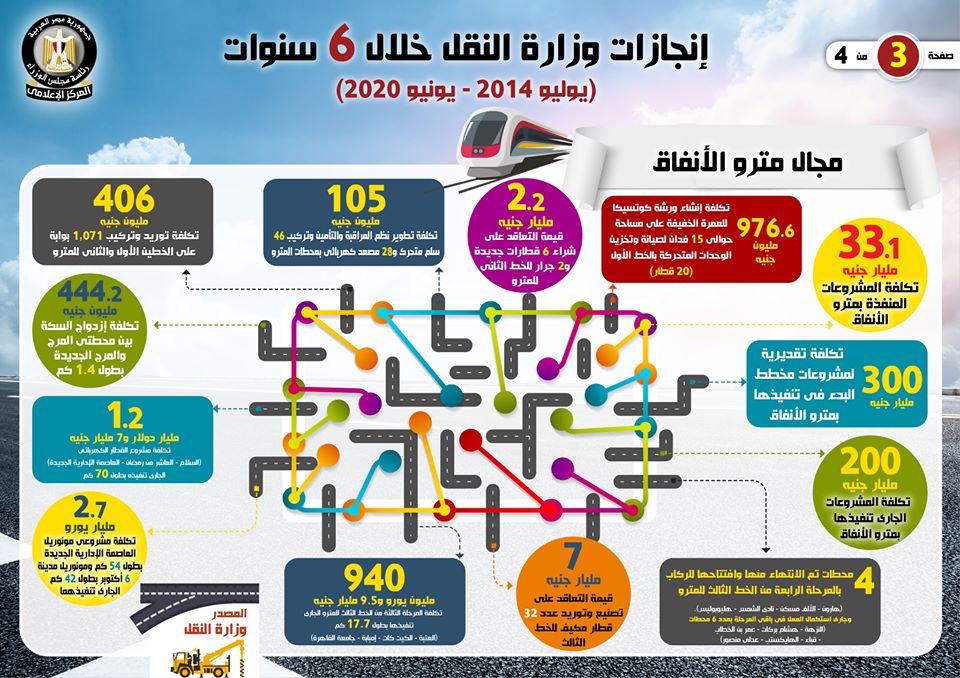 وجاء في الإنفوجراف، أن تكلفة المرحلة الثالثة من الخط الثالث للمترو بلغت 940 مليون يورو، و9.5 مليار جنيه، والتي جاري تنفيذها بطول 17.7 كيلو متر، (العتبة – الكيت كات –إمبابة – جامعة القاهرة)، كما بلغت تكلفة مشروع القطار الكهربائي (السلام – العاشر من رمضان – العاصمة الإدارية الجديدة) 1.2 مليار دولار، و7 مليار جنيه، حيث يجري تنفيذه بطول 70 كيلو متر، وكذلك جاري تنفيذ مشروعي مونوريل العاصمة الإدارية الجديدة بطول 54 كيلو متر، ومونوريل مدينة 6 أكتوبر بطول 42 كيلو متر، بتكلفة 2.7 مليار يورو.