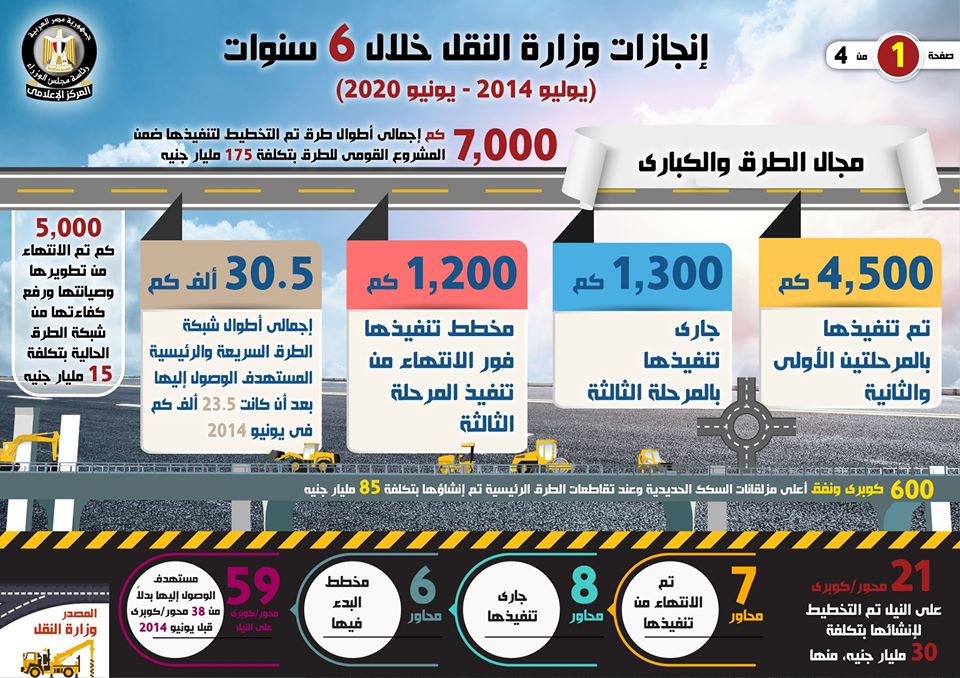 ورصد الإنفوجراف، أنه تم الانتهاء من تطوير وصيانة ورفع كفاءة 5000 كيلومتر من شبكة الطرق الحالية بتكلفة 15 مليار جنيه، هذا بجانب التخطيط لإنشاء 21 محور/كوبري على النيل بتكلفة 30 مليار جنيه، منها 7 محاور تم الانتهاء من تنفيذها، وكذلك جاري تنفيذ 8 محاور أخرى، ومن المخطط البدء في إنشاء 6 محاور، ليصل إجمالي المستهدف الوصول إليه إلى 59 محور/كوبري على النيل بدلاً من 38 محور/كوبري قبل يونيو 2014، كما تم إنشاء 600 كوبري ونفق أعلى مزلقانات السكك الحديدية وعند تقاطعات الطرق الرئيسية بتكلفة 85 مليار جنيه.
