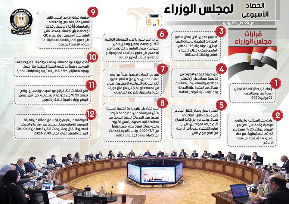 وجاء في الإنفو جراف أنه تمت الموافقة على عدد من القرارات، تشمل الموافقة على إلغاء قرار حظر الحركة الجزئي اعتباراً من يوم السبت 27 يونيو 2020، وكذلك الموافقة على إعادة فتح المطاعم والصالات الرياضية والمقاهي، لكن مع السماح بتواجد 25% فقط من قدرتها الاستيعابية، مع حظر تقديم " الشيشة" في هذه الأماكن، فضلاً عن استمرار العمل بشأن بعض التدابير الاحترازية المتخذة بوحدات الجهاز الإداري للدولة وشركات القطاع العام وشركات قطاع الأعمال العام، والفئات المستثناة، بجانب غلق جميع المحال التجارية في التاسعة مساءً، على أن تستمر المطاعم والمقاهي حتى العاشرة مساءً، مع استمرار غلق الحدائق والمتنزهات والشواطئ العامة، كما تمت الموافقة على استمرار عمل وسائل النقل الجماعي حتى منتصف الليل، الساعة 12 مساءً، وذلك من أجل إتاحة المجال أمام حركة المواطنين، على أن تعاود التشغيل مجدداً في الرابعة من صباح اليوم التالي، بالإضافة إلى فتح دور العبادة تدريجياً اعتباراً من يوم السبت المقبل، لكن مع استمرار تعليق أداء العبادات الجماعية الأسبوعية، سواء في المساجد أو الكنائس، مع غلق دورات المياه واستمرار غلق دور المناسبات.