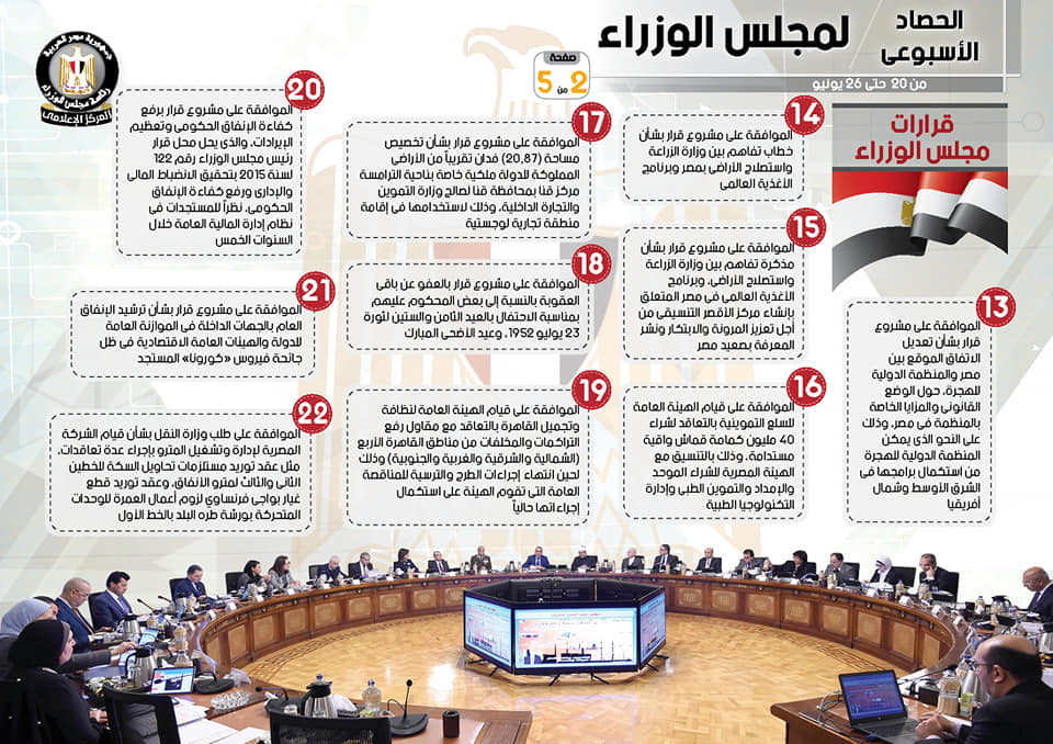 وأبرز الإنفوجراف أنه تمت الموافقة على مشروع قرار بالعفو عن باقي العقوبة بالنسبة إلى بعض المحكوم عليهم بمناسبة الاحتفال بالعيد الثامن والستين لثورة 23 يوليو 1952، وعيد الأضحى المبارك، فضلاً عن الموافقة على مشروع قرار برفع كفاءة الإنفاق الحكومي وتعظيم الإيرادات، والذي يحل محل قرار رئيس مجلس الوزراء رقم 122 لسنة 2015 بتحقيق الانضباط المالي والإداري ورفع كفاءة الإنفاق الحكومي، نظراً للمستجدات في نظام إدارة المالية العامة خلال السنوات الخمس، وكذلك الموافقة على مشروع قرار بشأن ترشيد الإنفاق العام بالجهات الداخلة في الموازنة العامة للدولة والهيئات العامة الاقتصادية في ظل جائحة فيروس "كورونا" المستجد، هذا بجانب الموافقة على طلب وزارة النقل بشأن قيام الشركة المصرية لإدارة وتشغيل المترو بإجراء عدة تعاقدات، مثل عقد توريد مستلزمات تحاويل السكة للخطين الثاني والثالث لمترو الأنفاق، وعقد توريد قطع غيار بواجي فرنساوي لزوم أعمال العمرة للوحدات المتحركة بورشة طره البلد بالخط الأول.