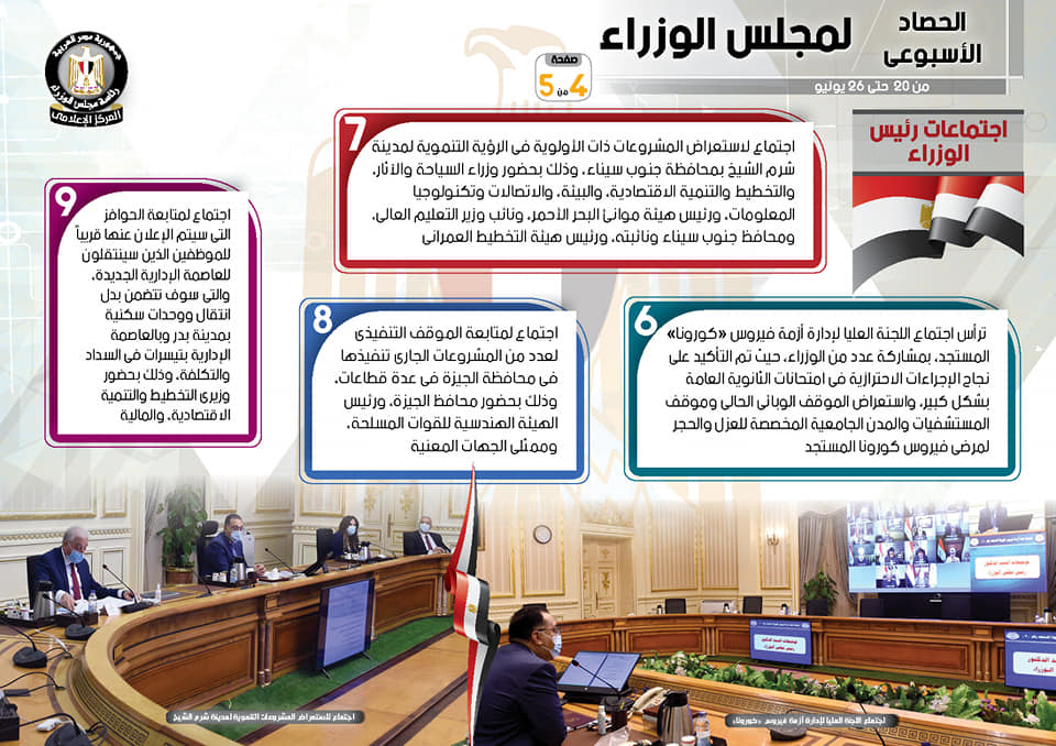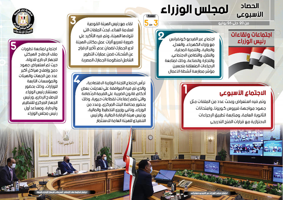 نشر المركز الإعلامي لمجلس الوزراء إنفوجرافاً سلط من خلاله الضوء على الحصاد الأسبوعي لمجلس الوزراء، وذلك خلال الفترة من 20 حتى 26 يونيو 2020، والذي تضمن الموافقة على عدد من القرارات، فضلاً عن الاجتماعات واللقاءات التي عقدها الدكتور مصطفى مدبولي، رئيس مجلس الوزراء، بالإضافة إلى ما قام به سيادته من أنشطة.