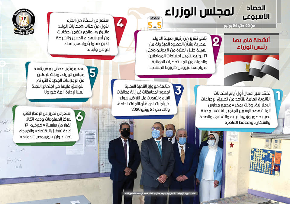 وبشأن الأنشطة التي قام بها السيد رئيس مجلس الوزراء، فبحسب الإنفوجراف، فقد تم تفقد سير أعمال أول أيام امتحانات الثانوية العامة للتأكد من تطبيق الإجراءات الاحترازية، وذلك بمقر "مجمع مدارس الملك فهد الرسمي المتميز للغات" بمدينة نصر، بحضور وزيري التربية والتعليم، والصحة والسكان، ومحافظ القاهرة، فضلاً عن تلقي تقرير من رئيس هيئة الدواء المصرية بشأن الجهود المبذولة من الهيئة خلال الفترة من 8 يونيو وحتى 17 يونيو لتأمين احتياجات المواطنين والدولة من المستحضرات الدوائية لمواجهة فيروس كورونا المستجد، وكذلك استعراض نسخة من الجزء الأول من كتاب "حكايات الولاد والأرض"، والذى يتضمن حكايات من أسر شهداء الجيش والشرطة الذين ضحوا بأرواحهم فداء للوطن وأبنائه، بجانب عقد مؤتمر صحفي بمقر رئاسة مجلس الوزراء، وذلك للإعلان عن الإجراءات الجديدة التي تم التوافق عليها في اجتماع اللجنة العليا لإدارة أزمة كورونا، بالإضافة إلى متابعة مع وزير التنمية المحلية لجهود المحافظات في إزالة مخالفات البناء والتعديات على الأراضي، سواء على أملاك الدولة، أو الأملاك الخاصة، وذلك حتى 23 يونيو 2020، كما تم استعراض تقرير عن الإصدار الثاني لمركز المعلومات ودعم اتخاذ القرار من سلسلة " كوفيد- 19.. إعادة تشغيل الاقتصاد" والذي جاء تحت عنوان " رؤى وخبرات دولية".