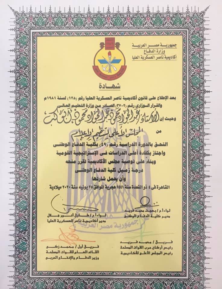 وجه ابو كب الشكر للقادة والأساتذة في أكاديمية ناصر وكلية الدفاع