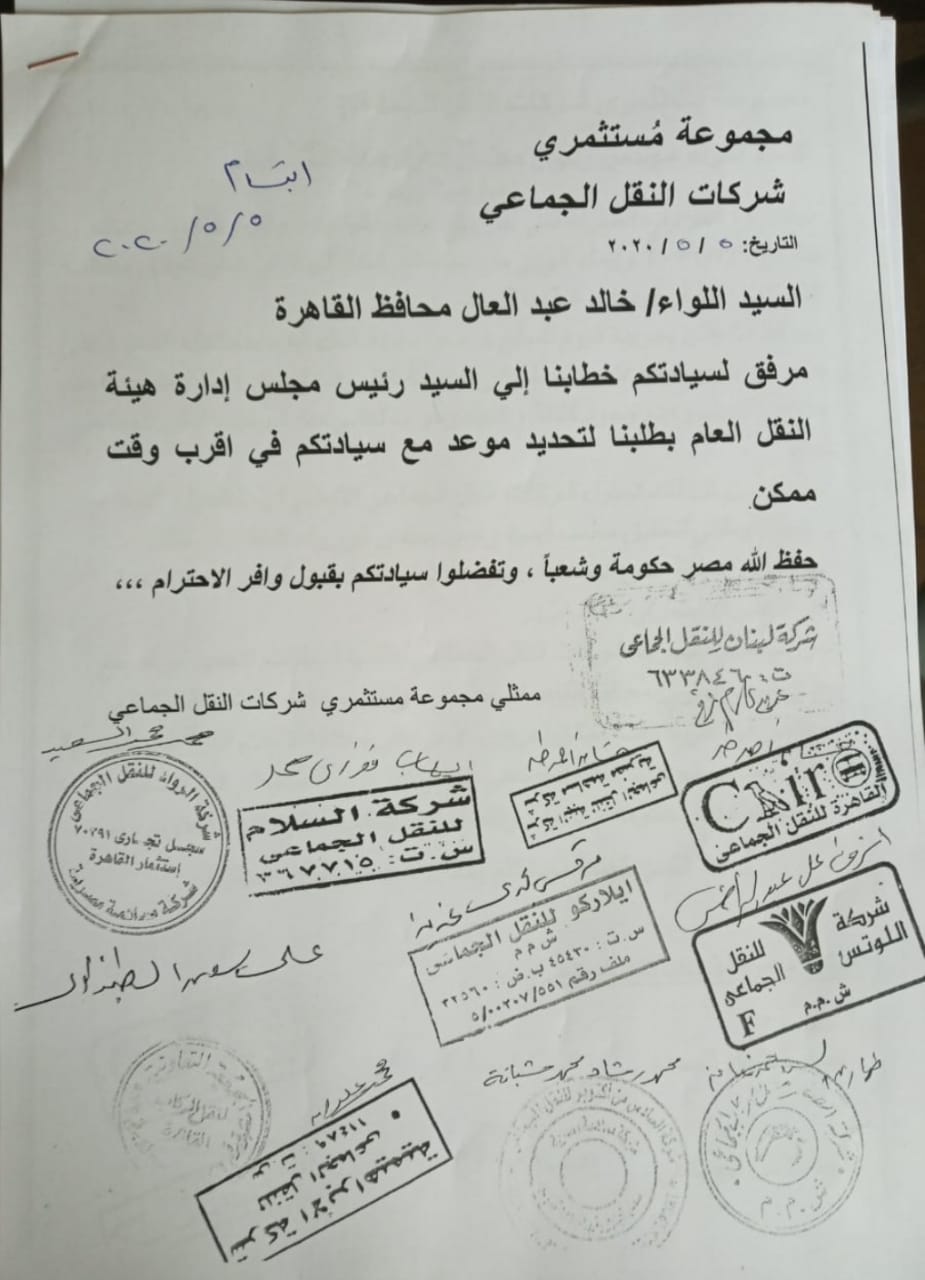 وأضافت الشركات ايضا أن فرض حظر التجوال والظروف الاستثنائية التي فرضتها الحكومة على الموظفين سواء في القطاع العام او الخاص وكذلك مع القيود الصارمة والغرامات التي تفرضها هيئة النقل العام على هذه الشركات أدت إلى تفاقم الأزمة ووصولها إلى طريق مسدود مما جعلها تطالب بعقد اجتماع طاريء وفوري مع محافظ القاهرة للتدخل لحل هذه المشاكل وتدارك المشكال قبل تفاقمها.
