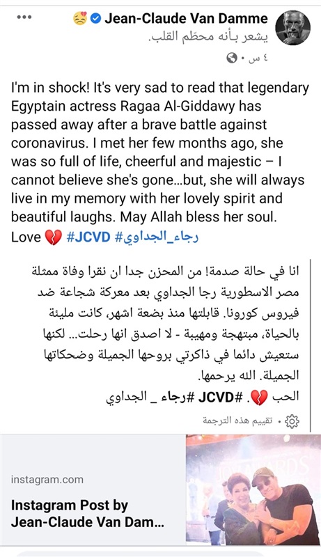 ودع النجم جان كلود فان دام، عبر حسابه الرسمي على إنستجرام، الفنانة رجاء الجداوي، التى وافتها المنية أمس الأحد، إثر إصابتها بفيروس كورونا المستجد.