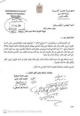 وافق الفريق كامل الوزير، وزير النقل، على طلب السيد المهندس أشرف رسلان رئيس هيئة السكة الحديد بإثابة العاملين بالهيئة والشركات التابعة للهيئة بمكافاة تشجيعية بمبلغ ٧٥٠ جنيه تقديرًا لمجهوداتهم المبذوله لراحة جمهور الركاب في ظل الظروف التي تمر بها البلاد.