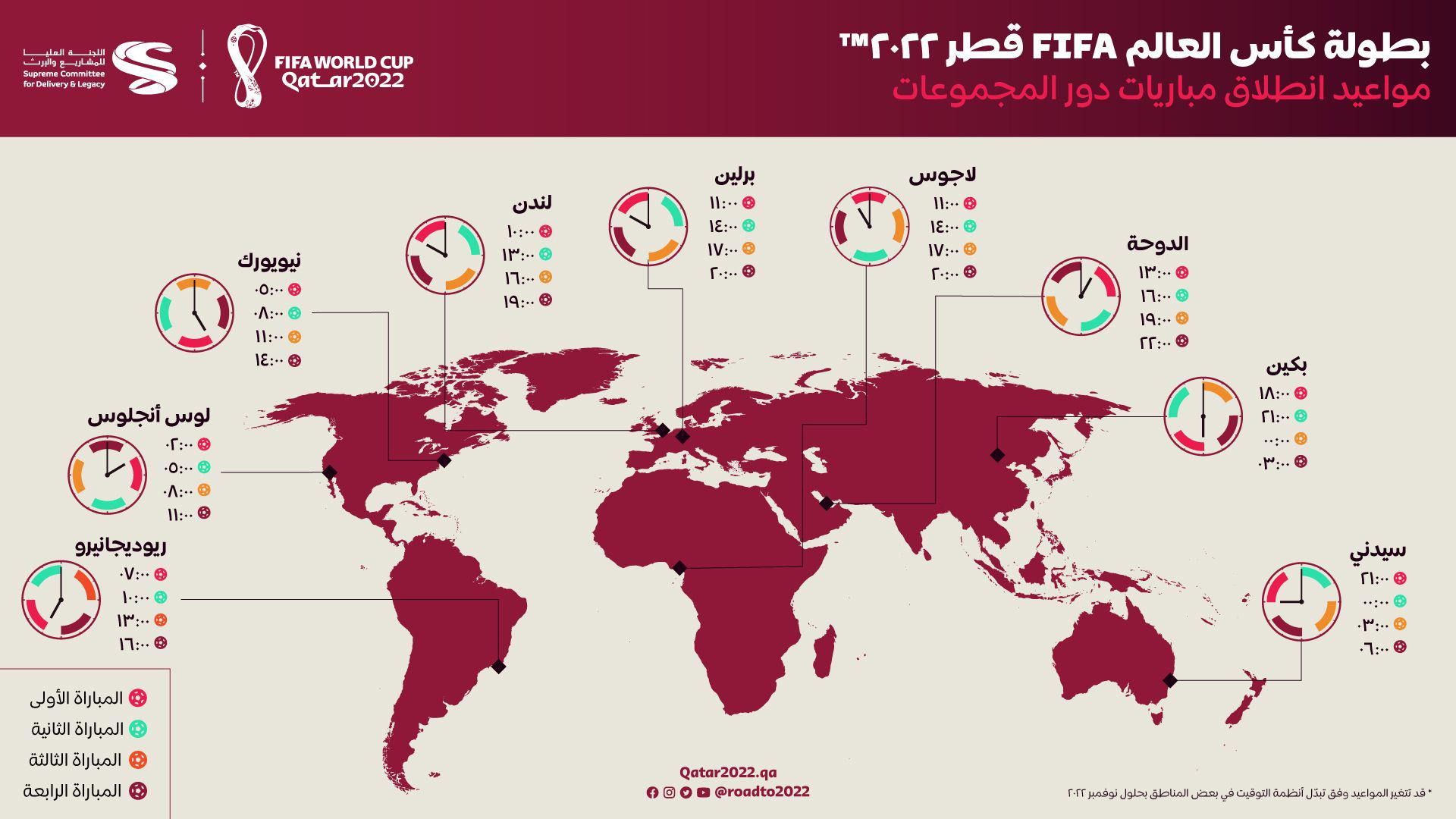 ومن المقرر أن تقام 4 مباريات يوميا فى الدور الأول لكأس العالم 2022، في المواعيد التالية بتوقيت القاهرة: 12 ظهرا، الثالثة عصرا، السادسة مساء، والتاسعة مساء، حيث أكد الموقع الرسمى للفيفا أن ذلك يأتي بهدف توفير الراحة الكافية لكل الفرق بين مبارياتهم، وهذا سيسمح للجماهير بالإستمتاع بجدول متكامل ومثير. وتقام منافسات دور الستة عشر للمونديال بواقع مباراتين في اليوم تقاما في الساعة الخامسة مساء والتاسعة مساء بتوقيت القاهرة، وهو نفس توقيت مباريات الدور ربع النهائي.