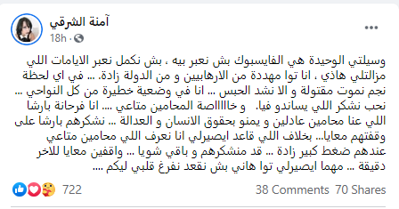 وحرصت الشرقاوى على التعليق بعد إصدار حكم السجن ضدها، بمنشور جديد عبر حسابها وكتبت "وسيلتى الوحيدة هى الفيس بوك بش نعبر بيه، بش نكمل نعبر الايامات اللي مزالتلي هاذي، أنا توا مهددة من الإرهابيين ومن الدولة زادة، فى أي لحظة نجم نموت مقتولة وإلا نشد الحبس، أنا في وضعية خطيرة من كل النواحي، نحب نشكر اللي يساندو فيا، وخاصة المحامين متاعى، أنا فرحانة بارشا اللي عنا محامين عادلين ويمنو بحقوق الإنسان والعدالة، نشكرهم بارشا على وقفتهم معايا، بخلاف اللى قاعد ايصيرلى أنا نعرف اللي محامين متاعي عندهم ضغط كبير زادة، قد منشكرهم وباقى شويا، واقفين معايا للآخر دقيقة، مهما ايصيرلي توا هاني بش نقعد نفرغ قلبى ليكم".
