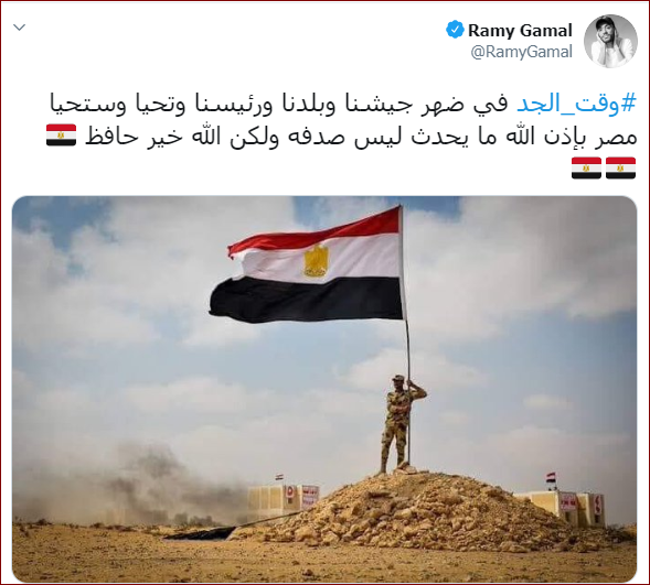 ونشر رامى، عبر حسابه على تويتر صورة لجندى يرفع العلم المصرى، صحبها بتعليق: "وقت الجد فى ضهر جيشنا وبلدنا ورئيسنا، وتحيا وستحيا مصر بإذن الله، ما يحدث ليس صدفة ولكن الله خير حافظ".