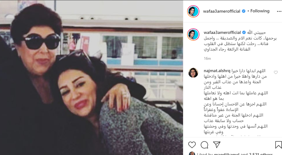 ونشرت الفنانة وفاء عامر صورة تجمعها بالراحلة رجاء الجداوى، عبر حسابها الرسمى بإنستجرام، وعلقت عليها: "حبيبتي الله يرحمها.. كانت نعم الأم والصديقة.. وأجمل فنانة... رحلت لكنها ستظل في القلوب، الفنانة الرائعة رجاء الجداوى".