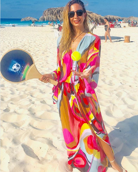 وارتدت هند فستان شيفون منقوش طويل بديل للكاش مايوه القصير ، وترتدي نظارة شمس سوداء وتمسك مضرب راكت والكورة الخاصة باللعبة الشهيرة على البحر