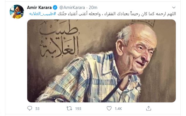 نعى النجم أمير كرارة الدكتور محمد مشالى الشهير بلقب طبيب الغلابة، الذى توفى اليوم الثلاثاء، وغرد كرارة عبر حسابه على تويتر قائلا: "اللهم ارحمه كما كان رحيماً بعبادك الفقراء، واجعله أغنى أغنياء جنّتك طبيب الغلابة".
