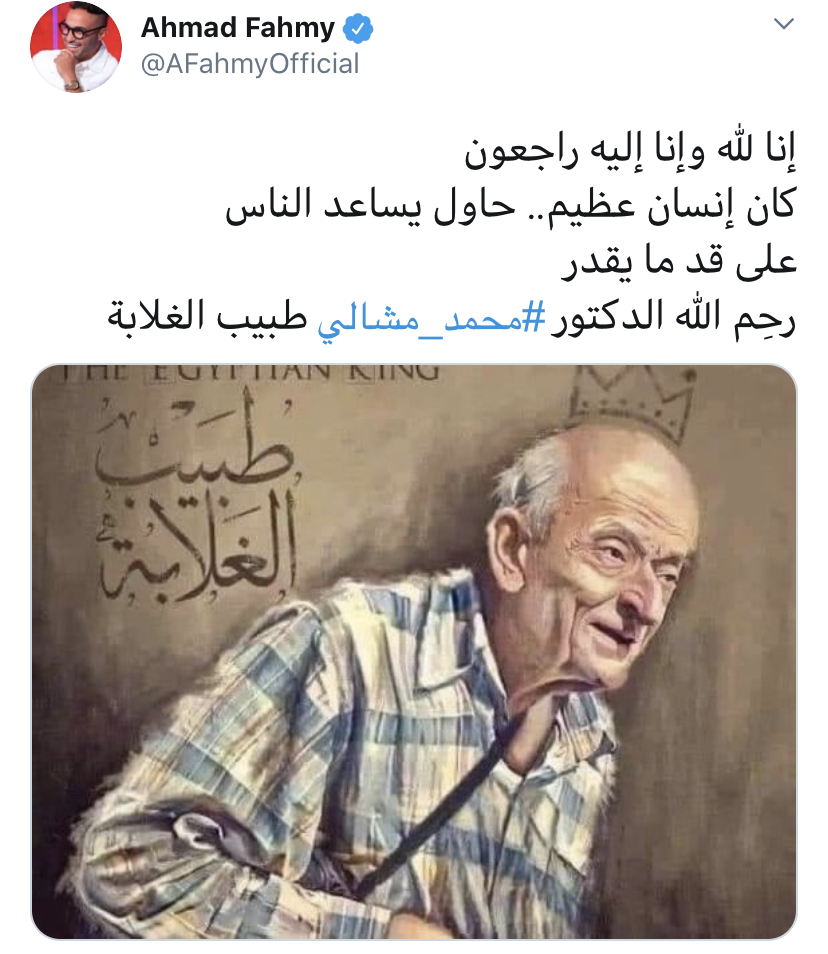 نعى النجم أحمد فهمى الدكتور محمد مشالى، الشهير بلقب "طبيب الغلابة، الذى توفى اليوم الثلاثاء، وغرد فهمى عبر حسابه قائلا:" إنا لله وإنا إليه راجعون كان إنسان عظيم.. حاول يساعد الناس على قد ما يقدر رحِم الله الدكتور محمد مشالى طبيب الغلابة".