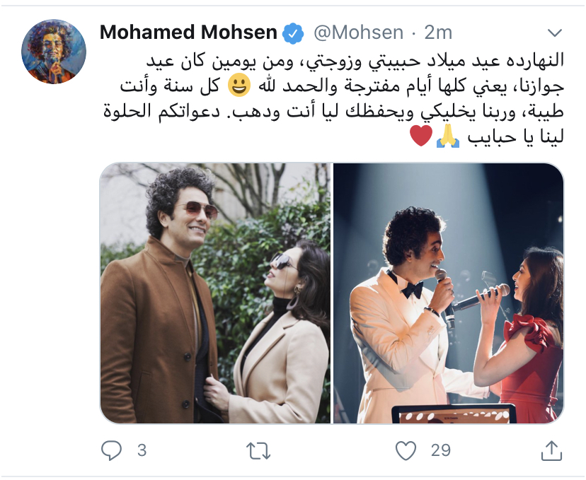 احتفل الفنان محمد محسن، بعيد ميلاد زوجته الفنانة هبة مجدى، موجها له رسالة حب عبر حسابه على تويتر، وكتب محسن قائلا:"النهارده عيد ميلاد حبيبتي وزوجتى، ومن يومين كان عيد جوازنا، يعني كلها أيام مفترجة والحمد لله كل سنة وأنت طيبة، وربنا يخليكي ويحفظك ليا أنت ودهب دعواتكم الحلوة لينا يا حبايب".