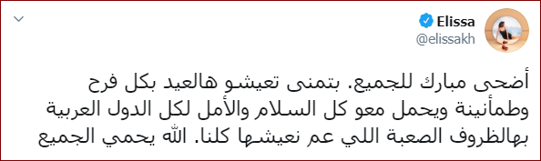 وكتبت اإليسا، عبر حسابها على تويتر، "أضحى مبارك للجميع، بتمنى تعيشو هالعيد بكل فرح وطمأنينة ويحمل معه كل السلام والأمل لكل الدول العربية بهالظروف الصعبة اللى عم نعيشها كلنا، الله يحمى الجميع".