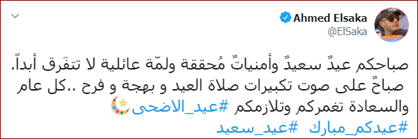 هنأ النجم أحمد السقا الشعب المصرى والأمة العربية والإسلامية، بحلول عيد الأضحى المبارك، متمنيا أن يكون عيدا سعيدا على الجميع ولمة عائلية لا تتفرق أبدا. وكتب السقا، عبر حسابه على تويتر: "صباحكم عيد سعيد وأمنيات مُحققة ولمّة عائلية لا تتفَرق أبداً، صباحٌ على صوت تكبيرات صلاة العيد وبهجة وفرح.. كل عام والسعادة تغمركم وتلازمكم".