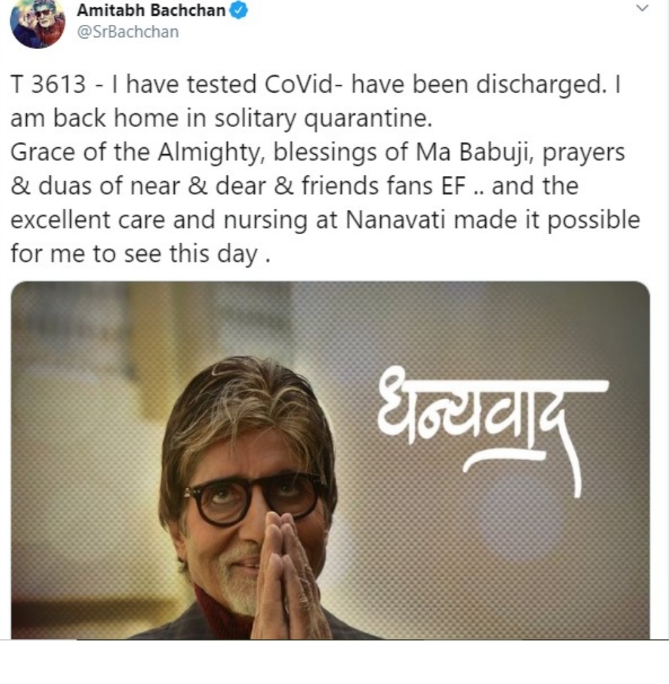 أعلن أسطورة الفن الهندي أميتاب باتشان عن شفائه من فيروس كورونا المستجد كوفيد 19 وذلك عبر تغريدة له على حسابه الشخصي على موقع المدونات القصيرة تويتر.
