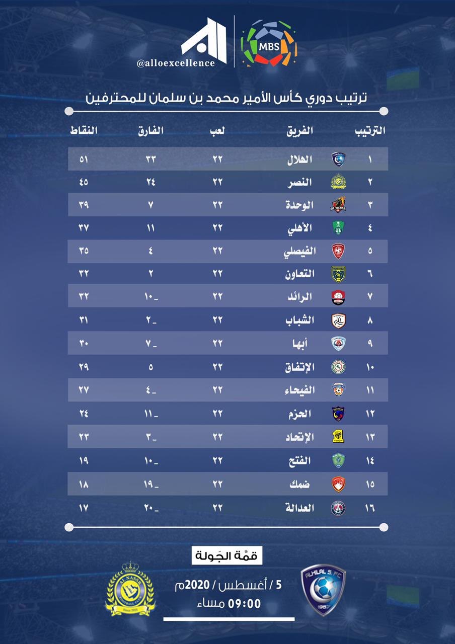 التعاون والرائد يحتلان المركزين السادس والسابع في جدول ترتيب الدوري السعودي برصيد 32 نقطة، ويتفوق الأول بفارق الأهداف.