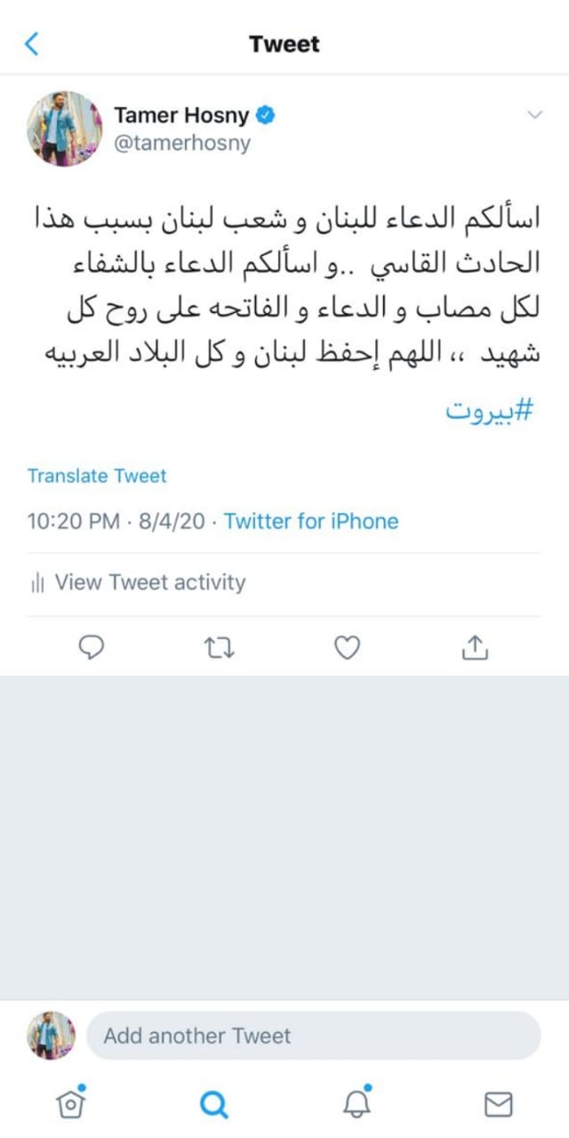 نشر النجم تامر حسني تغريدة على حسابه بتويتر عبر فيها عن حزنه وأسفه لما حدث بلبنان الشقيق، إثر الانفجار الذى هز العاصمة بيروت وأوقع عددا كبيرا من الضحايا، وقال في تغريدته: "أسألكم الدعاء للبنان وشعب لبنان بسبب هذا الحادث القاسي.. واسألكم الدعاء بالشفاء لكل مصاب والدعاء والفاتحة على روح كل شهيد.. اللهم احفظ لبنان وكل البلاد العربية".