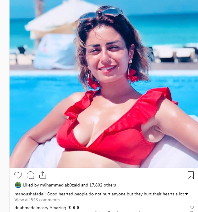 وظهرت في الصورة مرتدية مايوه ـبكيني أحمر ، وكانت تجلس أمام حمام السباحة مرتدية نظارة، وشعرها منسدل على كتفيها.