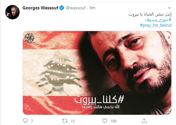 نشر المطرب السورى جورج وسوف، صورة مركبة له مع علم لبنان، مكتوب عليها: "كلنا بيروت.. الله يحمى هالبلد وأهلها"، فيما كتب فى تعليقه على الصورة التى نشرها عبر حسابه الشخصى على موقع التواصل الاجتماعى "تويتر"، "إنتِ نبض الحياة يا بيروت".