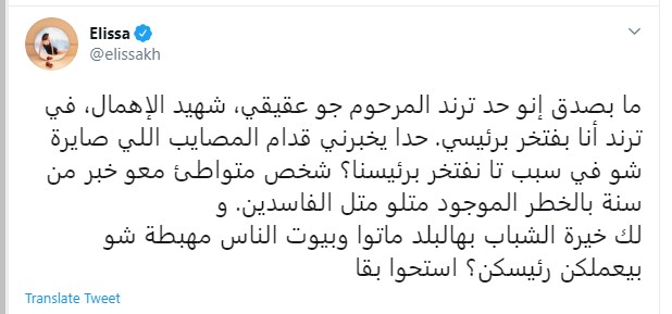 قالت المطربة اللبنانية إليسا إنه بينما يتصدر هاشتاج الشاب جو عفيفى، التريند فى لبنان، الذى مات نتيجة الإهمال لوجوده تحت الحطام الناتج عن تفجيرات بيروت لمدة أيام، ظهر تريند آخر بعنوان "أنا بفتخر برئيسى"، وهو الأمر الذى أثار غضبها، لتطرح تساؤل حول السبب الذى يجعلهم فخورين برئيسهم فى ظل المصائب التى يواجهها لبنان.