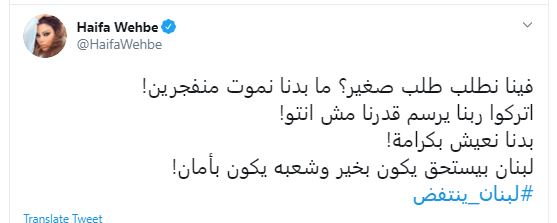 وكتبت الفنانة هيفاء وهبى، عبر حسابها بموقع تويتر: "فينا نطلب طلب صغير؟ ما بدنا نموت منفجرين! اتركوا ربنا يرسم قدرنا مش انتو! بدنا نعيش بكرامة! لبنان بيستحق يكون بخير وشعبه يكون بأمان!".