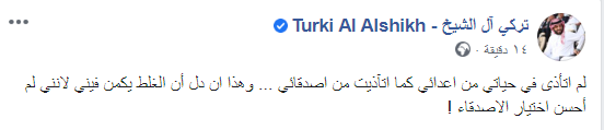 كشف المستشار تركى آل الشيخ، رئيس هيئة الترفيه السعودية، ومالك نادى ألميريا الإسبانى، عن رسالة عبر حسابه الشخصى "فيس بوك"، حيث تضمنت الرسالة كلمات مؤثرة عن خيانة الأصدقاء، قائلا: