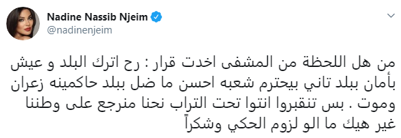 وقالت نادين فى تغريدة عبر حسابها الرسمى بتويتر: "من هل اللحظة من المشفى أخدت قرار: رح أترك البلد وعيش بأمان ببلد تاني بيحترم شعبه أحسن ما ضل ببلد حاكمينه زعران وموت، بس تنقبروا انتوا تحت التراب نحنا منرجع على وطننا غير هيك ما الو لزوم الحكي وشكراً".