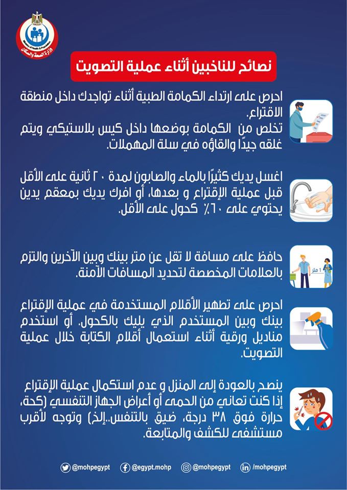 قدمت وزارة الصحة والسكان، من خلال صفحتها الرسمية على موقع التواصل الاجتماعي "فيسبوك"، نصائح للناخبين أثناء المشاركة في عملية التصويت بانتخابات مجلس الشيوخ للوقاية من فيروس كورونا المستجد.