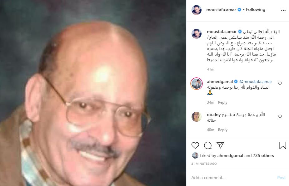 نعى النجم مصطفى قمر، عمه محمد قمر الذى توفى اليوم بعد صراع مع المرض، وذلك عبر حسابه على إنستجرام، حيث نشر مصطفى قمر صورة لعمه وكتب عليها قائلا: "البقاء لله تعالى توفى إلى رحمة الله منذ ساعتين عمى الحاج محمد قمر بعد صراع مع المرض اللهم اجعل مثواه الجنة كان طيب جدا وعمره ما زعل حد فينا الله يرحمه.. إنا لله وإنا إليه راجعون.. ادعوه له وادعوا لأمواتنا جميعا".