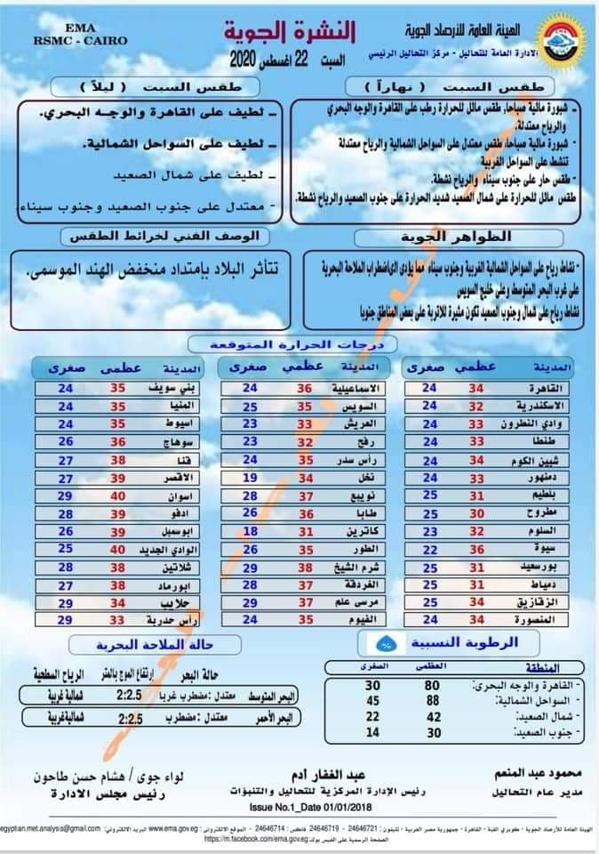 أما عن حالة الطقس مساء، أشارت الهيئة أنه معتدل على القاهرة والوجه البحري وشمال وجنوب الصعيد، على أن يكون لطيفا على السواحل الشمالية، بالإضافة إلى نشاط للرياح على شمال وجنوب الصعيد مثيرة للرمال والأتربة على مناطق من الجنوب.