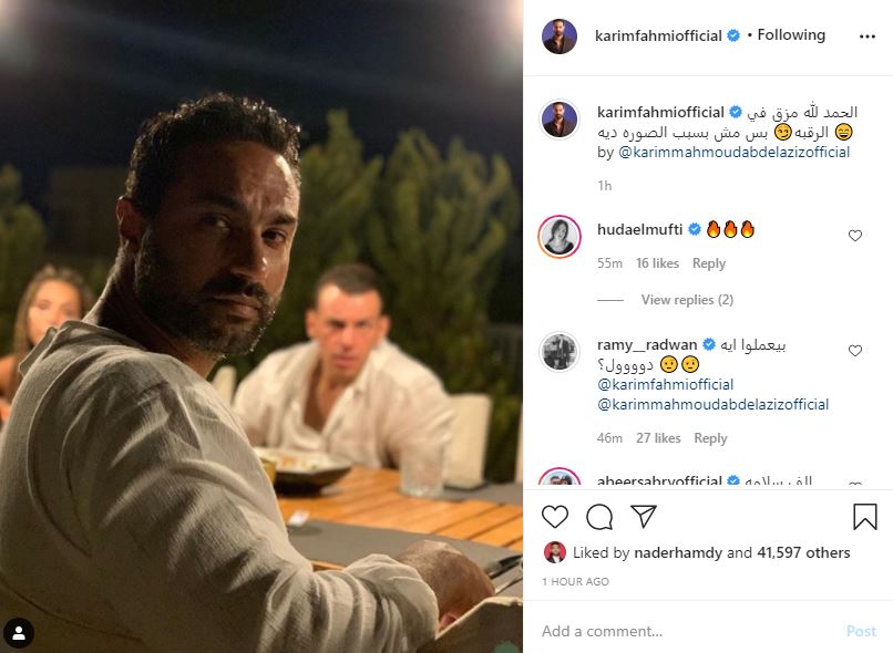 شارك الفنان كريم فهمى جمهوره، صورة جديدة له عبر حسابه على إنستجرام، التقاطها له صديقه الفنان كريم محمود عبد العزيز، وكتب على الصورة قائلا: "الحمد لله مزق فى الرقبة.. بس مش بسبب الصورة ديه".