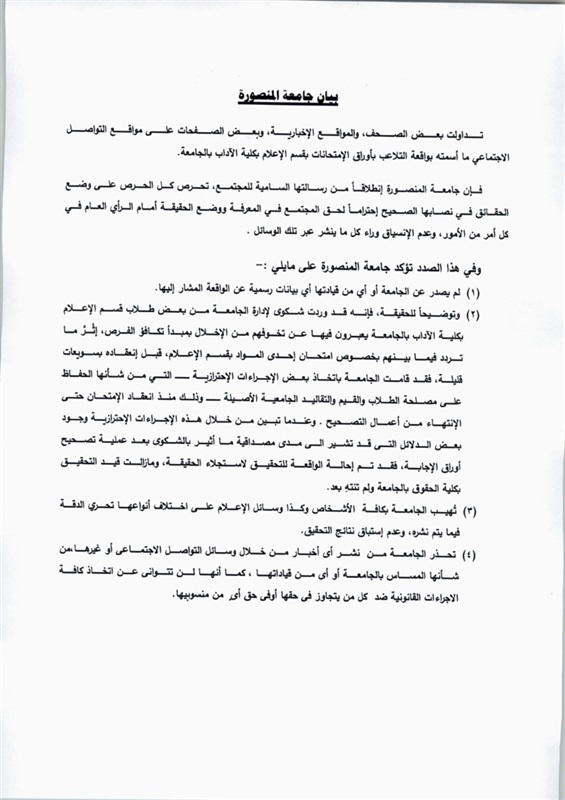وفي هذا الصدد أكدت جامعة المنصورة أنها لم تُصدر أو أي من قيادتها أي بيانات رسمية عن الواقعة المشار إليها وتوضيحًا للحقيقة، وأنه قد وردت شكوى لإدارة الجامعة من بعض طلاب قسم الإعلام بكلية الآداب بالجامعة، يعبرون فيها عن تخوفهم من الإخلال بمبدأ تكافؤ الفرص، إثْرَّ ما تردد فيما بينهم بخصوص امتحان إحدى المواد بقسم الإعلام، قبل انعقاده بسويعات قليلة، فقد قامت الجامعة باتخاذ بعض الإجراءات الاحترازية، التي من شأنها الحفاظ على مصلحة الطلاب والقيم والتقاليد الجامعية الأصيلة، وذلك منذ انعقاد الامتحان حتى الانتهاء من أعمال التصحيح.