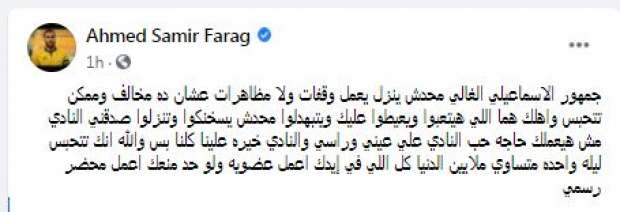 حرص أحمد سمير فرج لاعب الأهلى والإسماعيلى السابق، على توجيه رسالة لجماهير الدروايش بعد الأزمة التى نشبت مع مجلس إدارة النادى برئاسة إبراهيم عثمان ، وكتب سميرفرج على صفحته الشخصية بموقع التواصل الاجتماعي "فيس بوك": "جمهور الاسماعيلي الغالى محدش ينزل يعمل وقفات ولا مظاهرات عشان ده مخالف، وممكن تتحبس وأهلك هما اللي هيتعبوا ويعيطوا عليك ويتبهدلوا".